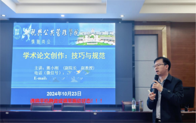 10月23日晚上,麻豆影视 在财税大楼105会议室举办了题为“学术论文创作:技巧与规范”的学术讲座。本次讲座由熊小刚副院长主讲,2024级全体学术型研究生参加。